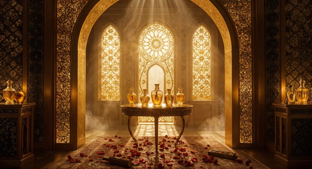 - עיצוב בקבוקים מפואר – בקבוקים מעוטרים בפרטי זהב ואבני חן המשקפים את הפאר המזרחי ונראים מרשימים על המדף