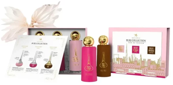 ראשית, בורג’ דובאי מלינה (לנשים) מציע חוויה פירותית-תבלינית מעודנת. ליצ’י, רוברב, ברגמוט ואגוז מוסקט יוצרים פתיחה רעננה ומפתה. לב הבושם מגלה שילוב מורכב של ורד טורקי, פיוני, מושק, פצ’ולי ווניל. הבסיס החם של קשמיר, ארז, וטיבר ולבונה משלים את החוויה בעושר ועומק. שנית, בורג’ דובאי ארינה (לנשים) מציג נגיעות הדריות וגורמה במיטבן. מנדרינה, תפוז, ברגמוט ואשכולית פותחים בזוהר מרענן. פריחת תפוז, פטל ודומדמניות שחורות מעניקים לב פרחוני-פירותי. קרם מתוק, מרשמלו, מושק ואמברט יוצרים סיומת מנחמת ומתוקה.